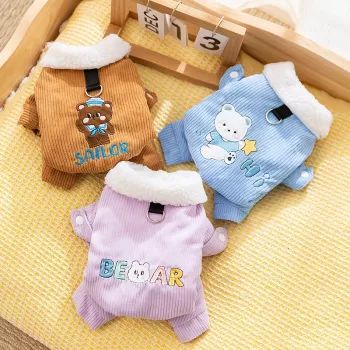Corduroy Puppy Coat with Cartoon Patch – Warm Four-Legged Cotton Outfit